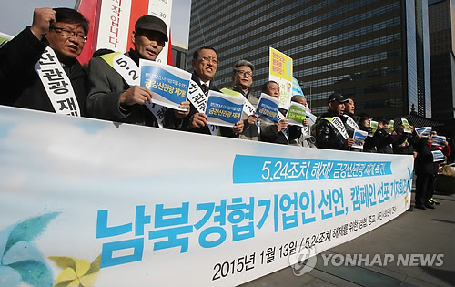 | △ '5·24조치 해제·금강산관광 재개 촉구' (서울=연합뉴스) 김주성 기자 = 남북경협기업비상대책위원회 등 30여개 단체로 구성된 '5·24 조치 해제를 위한 경협·종교·시민단체 연대' 소속 회원들이 13일 오후 서울 광화문광장에서 기자회견을 열고 5·24조치 해제와 금강산 관광을 재개할 것을 촉구하며 구호를 외치고 있다. 최근 200일간 릴레이 1인 시위를 진행해온 이들 단체는 다음 주부터 매주 화요일마다 경협 기업들의 피해 상황을 알리고 정부에 정책 변화를 촉구하는 캠페인을 진행할 예정이다. 2015.1.13 utzza@yna.co.kr |