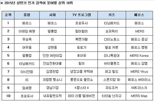 (서울=연합뉴스) 윤보람 기자 = 올 상반기 한국에서 가장 화제가 된 검색어는 '메르스'(중동호흡기증후군)인 것으로 조사됐다.