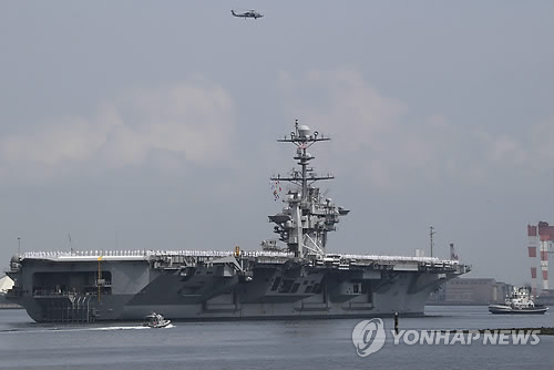 | △ 일본 가나가와현 요코스카(橫須賀) 미 해군기지를 사실상의 모항으로 해온 미국 조지 워싱턴 항공모함이 약 7년 만의 임무를 마치고 대규모 정비 등을 위해 지난 5월 18일(현지시간) 귀환길에 오른 모습이다. 2015.6.29. |