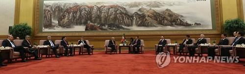 | △ 최경환 부총리 등 AIIB 대표 시진핑 주석과 회동 (베이징=연합뉴스) 이준삼 특파원 = 최경환 경제부총리 겸 기획재정부 장관(왼쪽 네번째)을 비롯해 각국의 아시아인프라투자은행(AIIB) 협상 대표들이 29일 오전 베이징(北京) 인민대회당에서 시진핑(習近平) 중국 국가주석(오른쪽 여섯번째)과 만나 AIIB에 대한 이야기를 나누고 있다. 각국 대표들은 이에 앞서 AIIB 협정문에 서명했다. 2015.6.29 jslee@yna.co.kr (끝) |