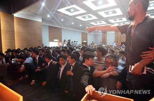 | △ 아수라장 주주총회 (성남=연합뉴스) 최종호 기자 = 29일 경기도 성남상공회의소에서 열린 삼성테크윈의 주주총회에서 김철교 현 대표이사 사장이 삼성그룹과 한화그룹의 '빅딜'에 따라 삼성테크윈의 사명을 한화테크윈으로 바꾸는 의안을 통과시키자 주주들이 반발하고 있다. zorba@yna.co.kr |