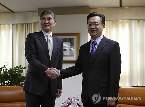 | △ 황준국 외교부 한반도평화교섭본부장(오른쪽)과 성 김 미국 국무부 대북정책 특별대표 (AP=연합뉴스 자료사진) |