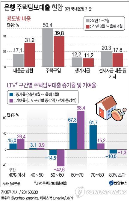 (서울=연합뉴스) 김지훈 기자 = 최근 급증세를 보인 은행 주택담보대출 중에서 실제로 집을 사기 위한 용도 비중은 줄어든 반면 다른 대출 돌려갚기용 비중은 2배 수준으로 커진 것으로 나타났다.