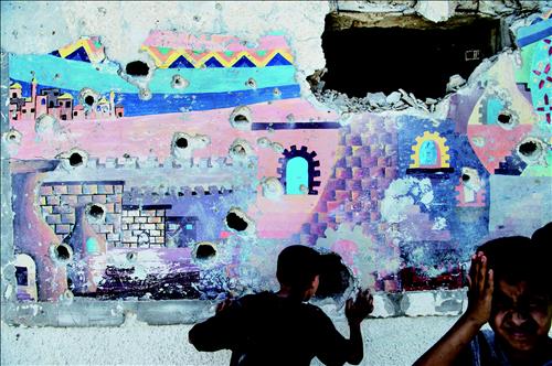 | △ 김상훈의 사진집에는 이 사진에 "대피소이자 난민캠프로 사용되던 자빌리야 유엔 학교 주변으로 새벽에 날아든 여러 발의 포탄 중에 한 발이 교실을 덮쳐, 자고 있던 난민 15명이 사망했다"는 설명이 붙어있다. ⓒ김상훈, 사진제공 눈빛출판사 |