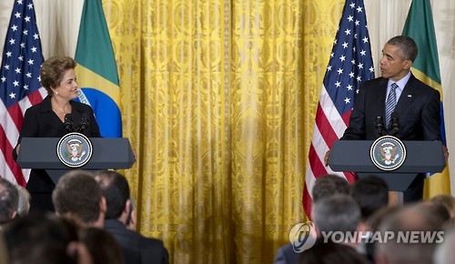 (워싱턴=연합뉴스) 신지홍 특파원 = 미국 국가안보국(NSA)의 도·감청 파문으로 불편했던 버락 오바마 대통령과 지우마 호세프 브라질 대통령이 30일(현지시간) 백악관에서 정상회담을 하고 양국 간 완전한 관계 회복을 선언했다.
