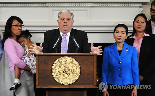 | △ '한국사위' 미 메릴랜드 주지사 "암 투병" (애나폴리스 AP/볼티모어 선=연합뉴스) '한국 사위' 래리 호건(59) 미국 메릴랜드 주지사가 지난 22일(현지시간) 자신의 림프종암 투병 사실을 공개하고 있다. 호건 주지사는 이날 주도인 애나폴리스 주지사 관저에서 긴급 기자회견을 통해 "상당히 진행되고 매우 공격적인 비 호지킨림프종(non-Hodgkin Lymphoma)암 3기 진단을 받았다"며 "곧 항암화학요법 치료를 시작할 것"이라고 덧붙였다. 부인 유미(왼쪽) 여사 등 그의 가족들이 배석해 있다. |