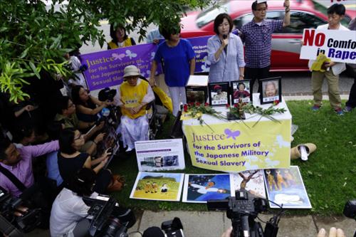 (워싱턴=연합뉴스) 김세진 특파원 = 한여름 낮의 태양도, 굳게 닫힌 주미 일본대사관의 문도, 아베 신조 일본 정권의 진정한 사죄와 명예회복을 촉구하는 군(軍) 위안부 피해 할머니의 목소리를 꺾지는 못했다.