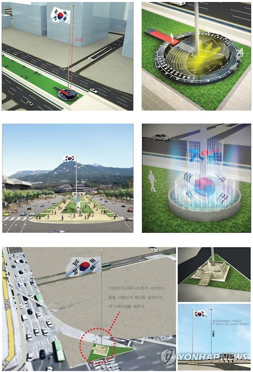 태극기 게양대 디자인 후보작은 ▲ 발광다이오드(LED) 조명을 활용한 '빛의 물결' ▲ 분수에 영상을 투영하는 '워터스크린' ▲ 전국 지방자치단체 수에 해당하는 243개의 돌을 모은 '돌탑' 등 3가지다.