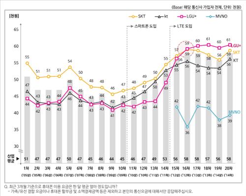 이어 "작년 1인당 월평균 휴대전화 요금은 LG유플러스가 6만1천원, SK텔레콤이 5만9천원, KT가 5만6천원이었다"며 "LG유플러스 요금이 비싼 것은 무선 데이터 만족률이 높았기 때문"이라고 분석했다.