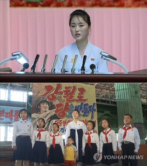 | △ 고아 키우는 '처녀어머니' 대대적으로 띄우는 북한 (서울=연합뉴스) 북한이 고아 7명을 거둬 키우는 스무살 미혼 여성 장정화의 미담에 '처녀어머니'라는 이름을 붙여 대대적으로 선전하고 있다. '사회와 집단을 위한 개인의 희생'을 강조하면서 체제 결속을 노리는 것으로 분석된다. 사진은 조선중앙TV가 지난달 13일부터 반복 방영 중인 장정화를 주제로 한 '소개편집물' 영상의 한 장면. 2015.7.2 nkphoto@yna.co.kr |