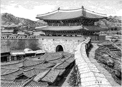 성곽을 비롯한 건축물과 인근 풍경이 명암이 더해진 그림으로 펼쳐져있다.