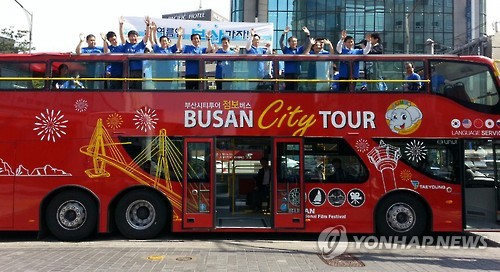 | △ (부산=연합뉴스) 서병수 부사시장을 비롯한 지역관광업계 인사 등 100여 명으로 구성된 부산관광 홍보단이 2일 지붕이 없는 2층 부산시티투어버스를 타고 서울 시내 일대에서 '올 여름엔 부산 가자'란 주제로 대규모 부산관광 로드쇼를 펼치고 있다. 이들은 할인 쿠폰북과 부산관광 홍보물을 나눠주며 수도권 관광객을 부산으로 유치하는 활동을 벌였다. 2015.7.2 << 부산관광공사 >> ccho@yna.co.kr |