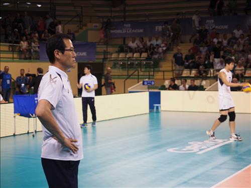| △ (카스텔노 르 레즈<프랑스>=연합뉴스) 김지헌 기자 = 문용관 남자배구 대표팀 감독이 2일(현지시간) 프랑스 카스텔노 르 레즈의 샤방델마스 실내경기장에서 열린 2015 월드리그 국제남자배구대회 한국과 프랑스의 경기를 지켜보고 있다. 2015.7.2 jk@yna.co.kr |