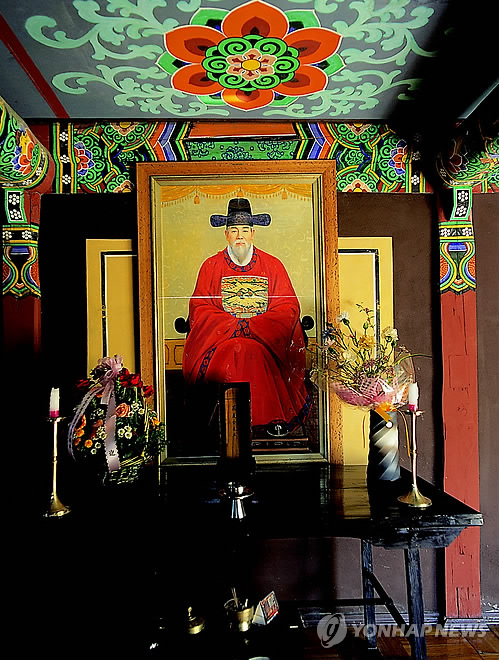 | △ 일본에서 태어나 조선으로 귀화한 '김충선 장군' (대구=연합뉴스) 광복 70년을 맞아 대구시 달성군 가창면 우록리 마을이 한일 우호의 상징으로 주목받고 있다. 이곳에는 일본에서 태어나 임진왜란 때 조선으로 귀화한 김충선(金忠善·1571∼1642년) 장군(일본명 사야가)의 후손들이 집성촌을 이뤄 생활하고 있다. 사진은 사당 녹동사(鹿洞祠)에 있는 김충선 장군 영정. 2015.7.3 <<달성 한일우호관>> suho@yna.co.kr |