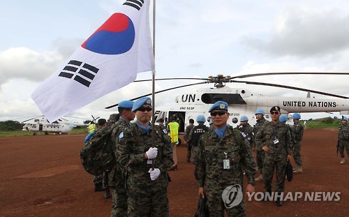 | △ 한빛부대 5기 현지도착 (보르<남수단>사진공동취재단=연합뉴스) 1일(현지시각) 남수단 종글레이주 보르공항에서 새로 투입되는 한빛부대 5기 대원들이 도착하고 있다. 긴 내전을 마치고 2011년 독립한 남수단은 소말리아를 제치고 세계 취약 국가지수 1위인 국가다. 우리나라에서 2013년 파병한 한빛부대원들이 현지인들에게 도로와 기반시설공사, 의료지원을 해 희망을 싹틔우고있다. 2015.7.3 seephoto@yna.co.kr |
