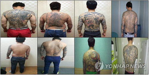 | △ 문신한 '구리식구파' (남양주=연합뉴스) 경기 남양주경찰서는 폭력조직 '구리식구파' 두목과 조직원을 합쳐 70명을 검거했다고 3일 밝혔다. 사진은 조직폭력배가 위력을 과시하려고 몸에 문신한 모습들. 2015.7.3 <<남양주경찰서 제공>> suki@yna.co.kr |