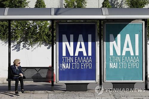 | △ 잘 돼야 할텐데… (아테네 AP=연합뉴스) 국제 채권단의 채무 협상안 수용 여부를 묻는 그리스 국민투표가 5일 오전 7시(현지시간) 막을 올린 가운데 아테내의 버스 정류장에 앉은 한 할머니가 "'유로'화에 예스" 등 찬성 투표를 촉구하는 글귀의 선전판을 바라보고 있다. 여론은 초박빙인 상황에서 그리스 유권자들이 구제금융안 조건을 거부하면 '아마겟돈'과 같은 재앙이 초래될 것이라고 마르틴 슐츠 유럽의회 의장이 경고했다. 이에 대해 야니스 바루파키스 그리스 재무장관은 그리스가 '전시 상태'라면서 유로존(유로화 사용 19개국)이 그리스 유권자를 굴복시키려 겁을 주고 있다고 비난했다. EU 집행위원장을 역임한 로마노 프로디 전 이탈리아 총리는 그리스 위기를 제대로 관리 못해 파국으로 치달으면서 EU 자체의 존립도 위험에 직면했다고 경고했다. bulls@yna.co.kr |