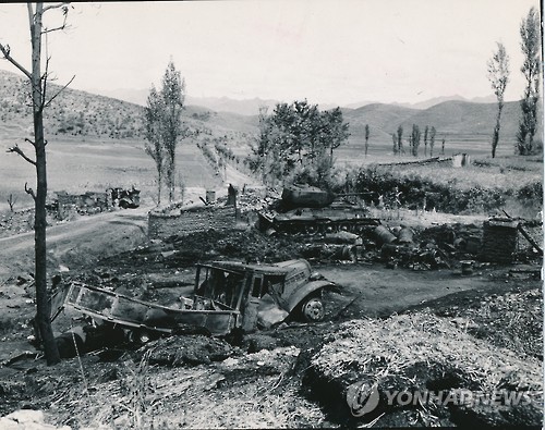 | △ 1950년 9월 2일 낙동강 근처에서 유엔군의 공습으로 파괴된 북한군 탱크와 트럭. (연합뉴스 자료사진) |