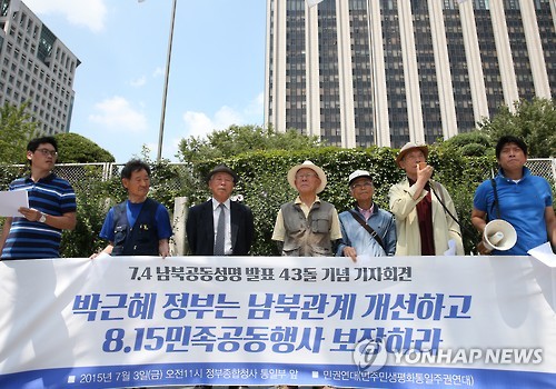 | △ 민권연대, 7.4남북공동성명 발표 43돌 기념 기자회견 (서울=연합뉴스) 전수영 기자 = 윤한탁(오른쪽 두번째) 민권연대 명예의장이 3일 오전 정부서울청사 앞에서 7.4 남북공동성명 정신 준수와 남북관계 개선을 촉구하는 발언을 하고 있다. 2015.7.3 swimer@yna.co.kr |