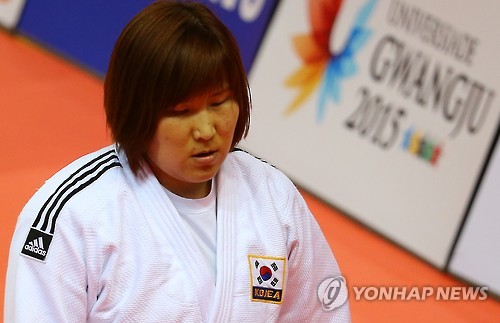 | △ 4일 오후 광주시 서구 염주빛고을체육관에서 열린 2015광주하계유니버시아드 여자 유도 +78kg급 결승에서 김민정이 일본 아사히나 사라에게 한판패를 당한 뒤 아쉬워하고 있다. |