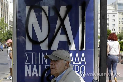 | △ (아테네 AP=연합뉴스) 3일(현지시각) 그리스 아테네 버스 정류장에 붙어 있는 '찬성' 독려 깃발. 누군가가 스프레이로 'OXI'(NO)라고 덧씌워 놓았다. |