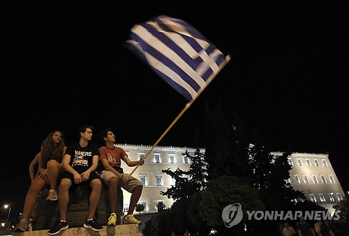 | △ 신타고그 광장에 나부끼는 그리스 국기 (아테네 EPA=연합뉴스) 채권단 제안에 대한 그리스 국민의 찬반을 묻는 투표가 치러진 5일(현지시간) 반대가 압도적이라는 결과가 나오자 아테네 신타고그 광장에서 반대 지지자들이 국기를 흔들고 있다. 2010596@yna.co.kr |