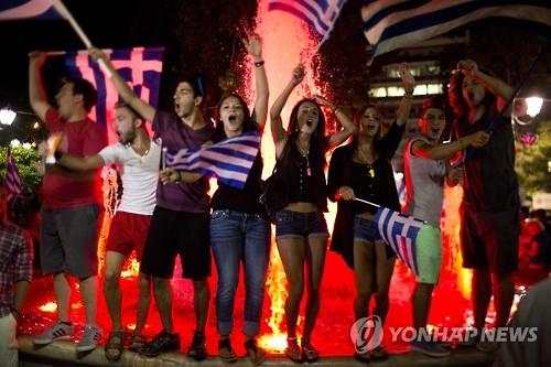 밤새 그리스 국기 휘날려…둥글게 모여 춤추며 자축