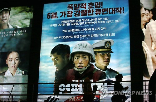 | △ '연평해전' 관객 100만명 돌파 (서울=연합뉴스) 박동주 기자 = 2002년 한·일 월드컵 결승전 전날 발발한 제2연평해전을 배경으로 만든 영화 '연평해전'이 관객 100만명을 돌파한 28일 서울 강남의 한 극장을 찾은 관람객들이 대형 포스터가 전시된 모니터 앞을 지나고 있다. 2015.6.28 pdj6635@yna.co.kr |