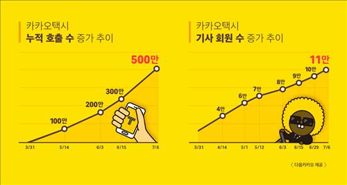 (서울=연합뉴스) 윤보람 기자 = 다음카카오[035720]는 콜택시 애플리케이션인 카카오택시의 누적 호출 건수가 출시 3개월 만에 500만건을 돌파했다고 6일 밝혔다.