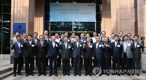 | △ 기업공감원스톱지원센터 개소식 (서울=연합뉴스) 6일 오후 서울 서초구 한국산업기술진흥협회에서 열린 '기업공감원스톱지원센터 개소식'에서 이상천 국가과학기술연구회 이사장(앞줄 왼쪽 다섯 번째부터), 이석준 미래창조과학부 제1차관, 박용현 한국산업기술진흥협회장 등 참석자들이 기념 촬영을 하고 있다. (미래창조과학부 제공) |
