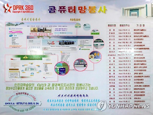 '콤퓨터망봉사'라는 제목이 붙은 이 포스터에는 '인민대학습당', '김책공업종합대학', '만경대정보센터', '조선중앙방송위원회', '노동신문사', '과학원 발명국' 등 모두 25개 기관의 홈페이지 명칭과 인터넷 주소가 공개됐다.
