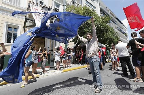 | △ (아테네 EPA=연합뉴스) 2일 아테네에서 벌어진 채권단 제안 반대 시위에서 한 시위자가 갈기갈기 찢긴 유럽연합(EU)기를 흔들어 보이고 있다. |