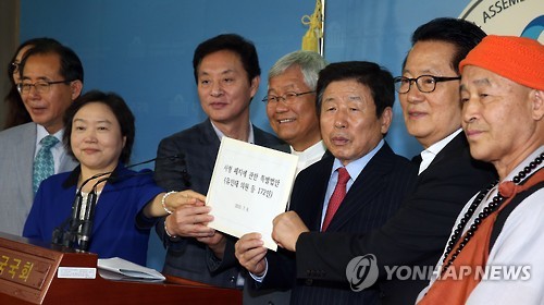 | △ 사형제도 폐지 법안 든 의원들과 종교인들 (서울=연합뉴스) 도광환 기자 = 새정치민주연합 유인태의원을 대표로 여야의원들과 종교인들이 6일 오전 국회 정론관에서 사형제도 폐지 특별법안을 국회 의안과에 제출하기에 앞서 법안을 들고 포즈를 취하고 있다. |