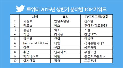 트위터 코리아는 7일 '2015년 상반기 분야별 인기 키워드'를 발표했다. 이는 올해 1∼6월 트위터에서 언급된 단어의 횟수를 분야별로 집계한 것이다.