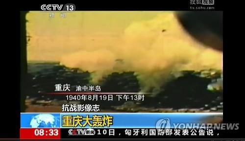 | △ (베이징=연합뉴스) 홍제성 특파원 = 중국이 제2차 세계대전 당시 일제가 저지른 '충칭(重慶) 대공습'의 참상을 담은 기록영상을 처음으로 공개했다. 관영 중국중앙(CC)TV는 11일 약 10분 분량의 특집 보도를 통해 당시 충칭에서 일본군이 전투기를 대거 동원해 무차별 폭격을 가하는 미공개 영상을 대거 공개했다. 2015.6.11 <<중국 CCTV 화면 캡쳐>> |