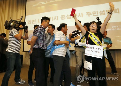 | △ 송도 LNG기지증설 반발 확산…주민설명회 두차례 무산 (인천=연합뉴스) 윤태현 기자 = 7일 오후 인천시 연수구 라마다송도호텔에서 열린 '인천 송도 LNG기지 증설 2차 주민설명회'에서 시민단체 회원들이 설명회 진행을 막고 있다. 인천 송도 LNG기지 증설은 수도권 도시가스 수요가 증가함에 따라 사업이 추진됐지만 혐오시설, 폭발 우려, 북한 공격 우려 등의 이유로 시민단체의 반대에 부딪히고 있다. 2015.7.7 tomatoyoon@yna.co.kr |