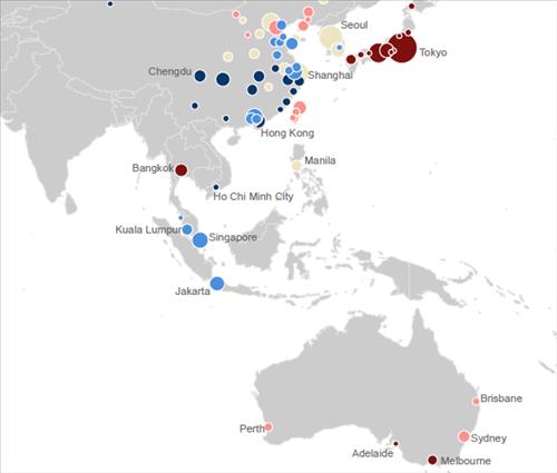 아태지역 100대 거대도시 가운데 중국 도시가 49개로 거의 절반을 차지했고, 일본 11개, 미국 10개, 대만 5개 등이 포함됐다.