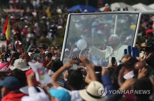 | △ 프란치스코 교황이 7일(현지시간) 미사를 집전하는 에콰도르 수도 키토의 공원에서 인파의 환영을 받고 있다.(AP=연합뉴스DB) |