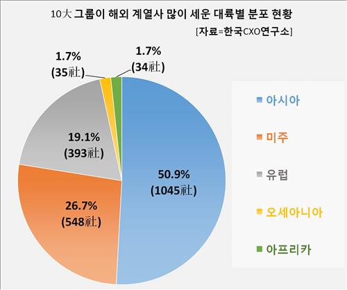 10대 그룹은 전 세계 91개국에 총 2천55개의 해외 독립법인을 둔 것으로 집계됐다, 가장 많은 계열사가 세워진 국가는 중국으로 470곳이었다.