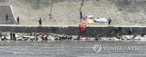 | △ 북한 양강도 혜산시 주민들이 압록강변에서 빨래를 하고 있다. |