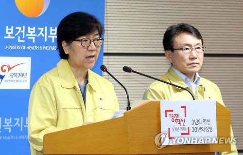| △ 메르스 사망자 8일만에 2명 발생…추가환자는 사흘째 '0' (세종=연합뉴스) 배재만 기자 = 정은경 중앙메르스관리대책본부 현장점검반장이 8일 오전 정부세종청사 보건복지부 공용브리핑룸에서 열린 중동호흡기증후군(메르스) 정례 브리핑에서 메르스로 인한 사망자가 8일 만에 2명 발생했고 추가 환자는 사흘째 나오지 않았다고 밝히고 있다. 오른쪽은 권덕철 총괄반장. |