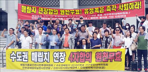 인천경실련·인천평화복지연대·서구주민대책위 등 시민단체와 주민단체 소속 50여 명은 이날 인천시청에서 기자회견을 열고, 매립지 합의의 원천 무효를 알리는 촛불집회와 서명운동을 대대적으로 전개할 것이라고 밝혔다.