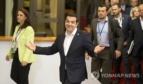 | △ '빈 손'으로 왔다 가요 (브뤼셀 AP=연합뉴스) 알렉시스 치프라스 그리스 총리가 7일(현지시간) 벨기에 브뤼셀에서 유로존(유로화 사용 19개국) 정상회의를 마친 후 회의장 건물을 떠나며 두 손을 벌려 보이고 있다. 이날 치프라스 총리가 진전된 새 협상안을 들고올 것이라는 기대를 깨고 빈 손으로 정상회의에 참석하자 불편한 심기를 드러낸 유로존 정상들은 9일까지 개혁안을 내놓되 12일 열리는 유럽연합(EU) 28개국 정상회의에서 구제금융 협상 재개 여부를 결정할 것이라고 최후통첩했다. |