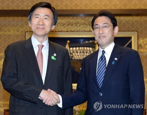 | △ 6월 21일 도쿄에서 열란 외교장관 회담에서 악수하는 윤병세 외교부 장관(왼쪽)과 기시다 후미오 일본 외무상. |