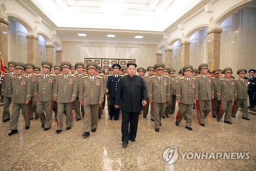 | △ 北 김정은, 김일성 21주기 맞아 금수산태양궁전 참배 (평양 조선중앙통신=연합뉴스) 김정은 북한 국방위원회 제1위원장이 김일성 주석 사망 21주기인 8일 0시 인민군 간부들을 대동하고 김일성 주석의 시신이 안치된 금수산태양궁전을 참배했다고 조선중앙통신이 보도했다. 2015.7.8 photo@yna.co.kr |