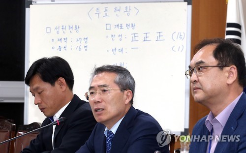 | △ 근로자위원 불참 속 내년 최저임금 16명 투표, 찬성 15 (세종=연합뉴스) 배재만 기자 = 박준성 최저임금위원장(오른쪽)이 9일 새벽 정부세종청사 최저임금위원회 전원회의실에서 내년도 최저임금 시급이 올해보다 8.1%(450원) 오른 6천30원으로 결정됐다고 밝히고 있다. 이날 회의에는 공익위원 9명, 사용자위원 9명, 근로자위원 9명 등 전체 27명의 위원 중 근로자위원들이 불참했다. 또 공익·사용자 위원 중 소상공인 대표 2명이 투표 직전 퇴장해 16명이 투표에 참여해 15명이 찬성표를 던졌다. 2015.7.9 scoop@yna.co.kr http://blog.yonhapnews.co.kr/f6464 |