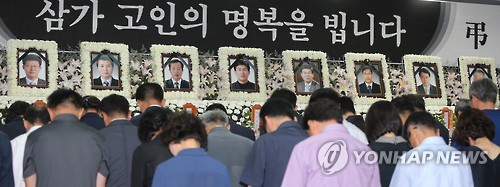 | △ "삼가 고인의 명복을 빕니다" (완주=연합뉴스) 김동철 기자 = 중국 연수 중 버스 추락사고를 당해 귀국한 공무원들이 9일 오전 전북 완주군 지방행정연수원에 복귀한 뒤 분향소를 찾아 고인들의 넋을 위로하고 있다. 2015.7.9 sollenso@yna.co.kr |