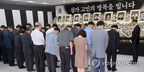 | △ "삼가 고인의 명복을 빕니다" (완주=연합뉴스) 김동철 기자 = 중국 연수 중 버스 추락사고를 당해 귀국한 공무원들이 9일 오전 전북 완주군 지방행정연수원에 복귀한 뒤 분향소를 찾아 고인들의 넋을 위로하고 있다. 2015.7.9 sollenso@yna.co.kr |