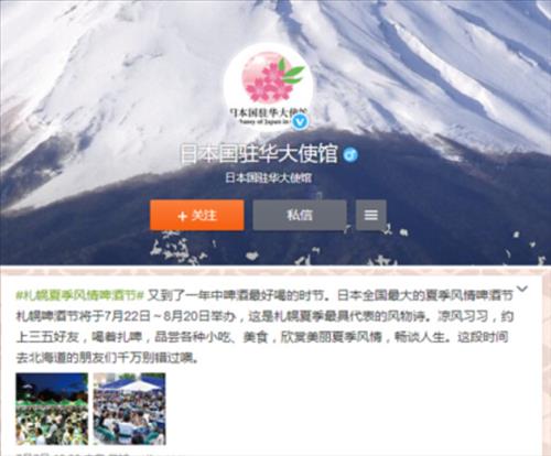 9일 중국청년보(中國靑年報) 등에 따르면 주중 일본대사관은 지난 7일 오후 공식 웨이보 계정을 통해 "또다시 1년 중 가장 맥주 마시기 좋은 날이 왔다"며 맥주 축제 풍경 등을 담은 사진과 함께 일본의 칠월칠석 행사 소식을 전했다.