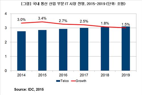 IDC는 한국의 통신 부문 IT 시장 규모가 작년 2조7천600억원으로 전년대비 3%가량 성장한데 이어, 올해도 네트워크 증설, 클라우드와 빅데이터 활성화 등으로 3.4% 커질 것이라고 내다봤다.